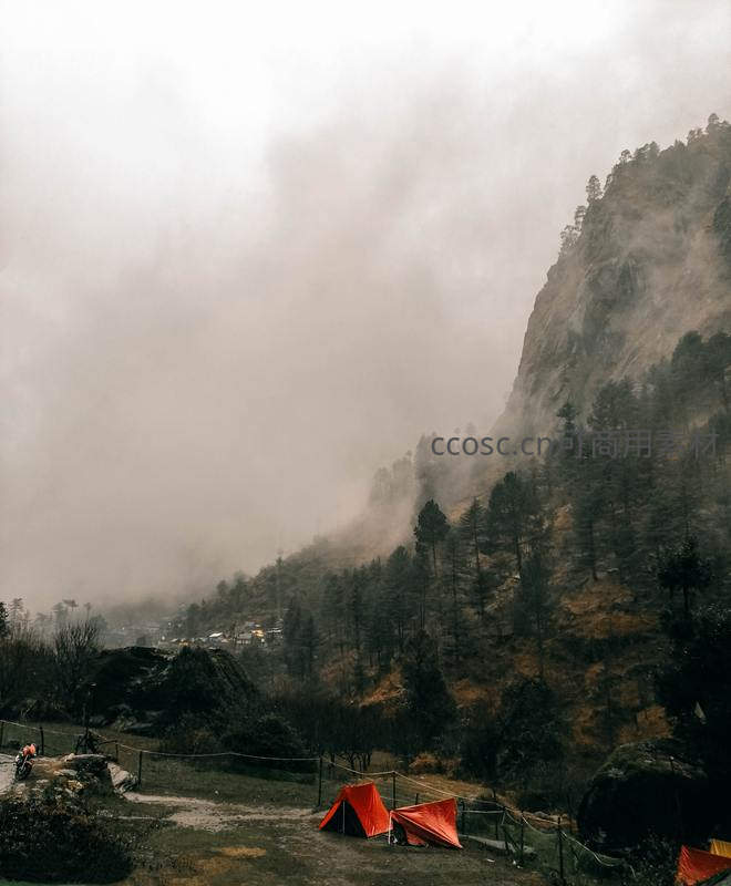 高海拔山区云雾弥漫,几顶鲜艳的橙色帐篷搭建在绿树环抱的营地中,远处是若隐若现的村庄,构成一幅壮丽而宁静的画面。