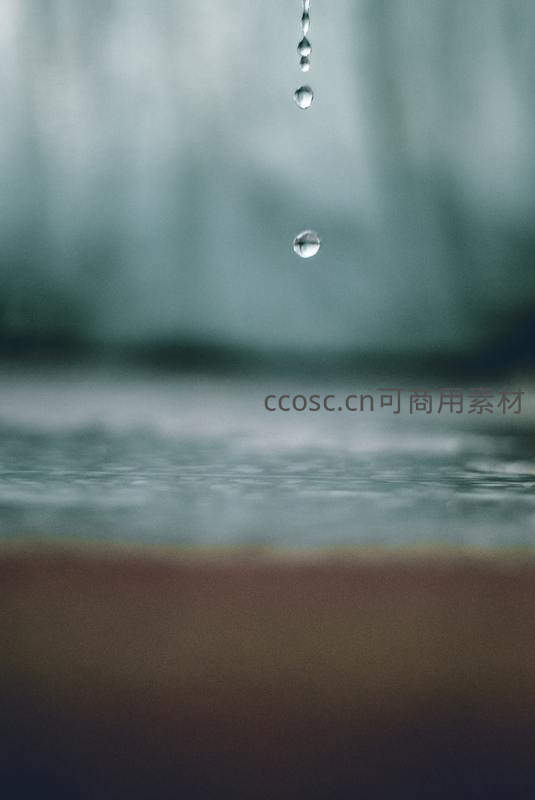 一颗晶莹的雨滴从空中缓缓下落,即将触碰水面,背景虚化处理突出了水滴的透明质感和动态美感,充满诗意。
