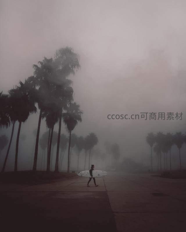 一名冲浪者手持冲浪板,在浓雾笼罩的棕榈树下小径上行走,画面静谧而充满故事感。