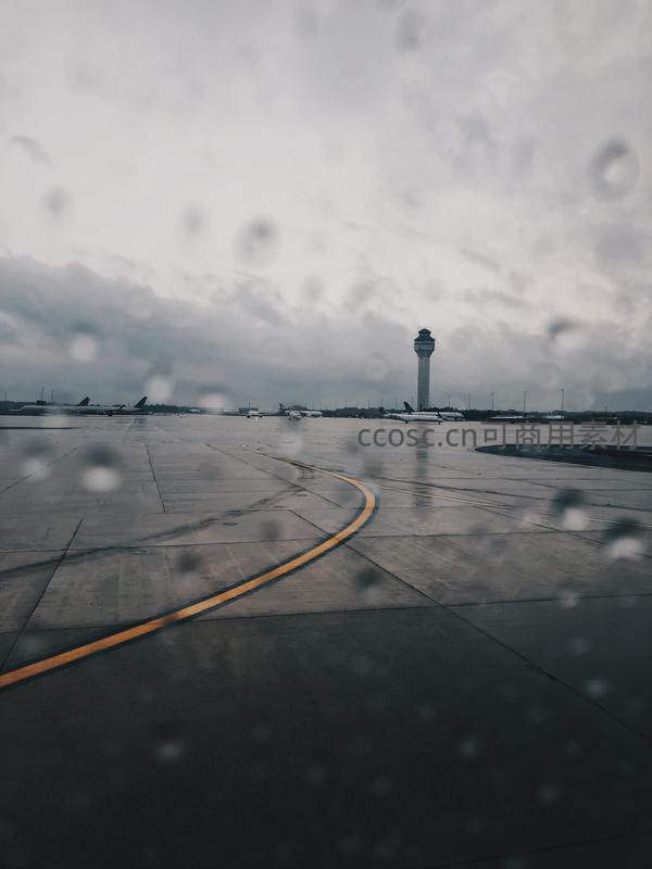 透过布满雨滴的玻璃望向机场,控制塔和停机坪在阴云下显得宁静而有序,充满旅途前的氛围。