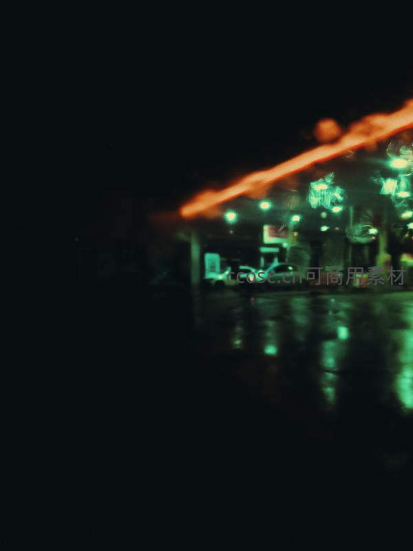夜晚雨中街景,霓虹灯光拉出流动光轨,模糊的车辆与建筑倒影交织,营造梦幻般的都市夜色。