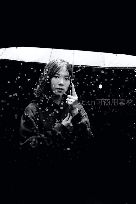 黑白影像中,一位女子在雨夜撑伞直视镜头,水珠在镜前散开,营造出强烈的视觉冲击与情绪张力。