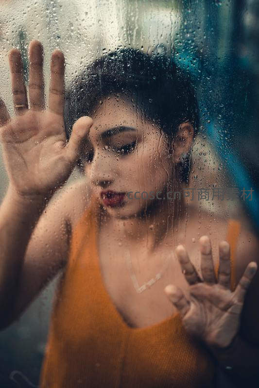 雨滴玻璃后的沉思女子
