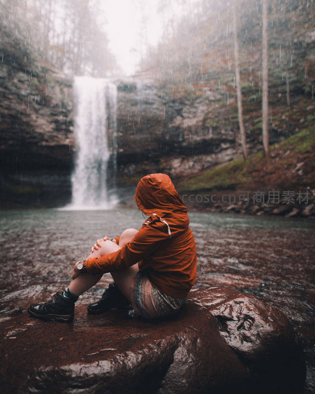 一位身穿橙色雨衣的旅人坐在瀑布前的湿滑岩石上,细雨纷飞,四周是苍翠的森林与奔腾的水流,营造出静谧而壮丽的自然氛围。