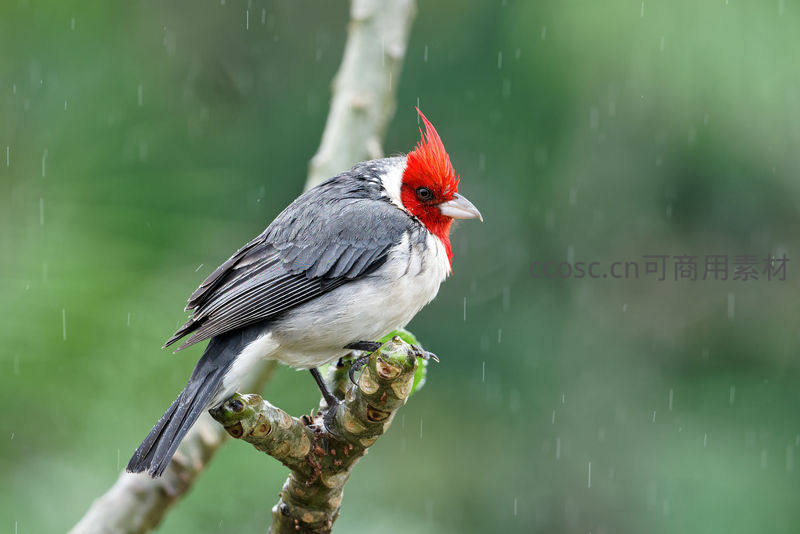 一只拥有鲜红色羽冠的小鸟静静栖息在树枝上,在细雨中显得格外生动,背景虚化突出主体,展现自然生态的细腻之美。