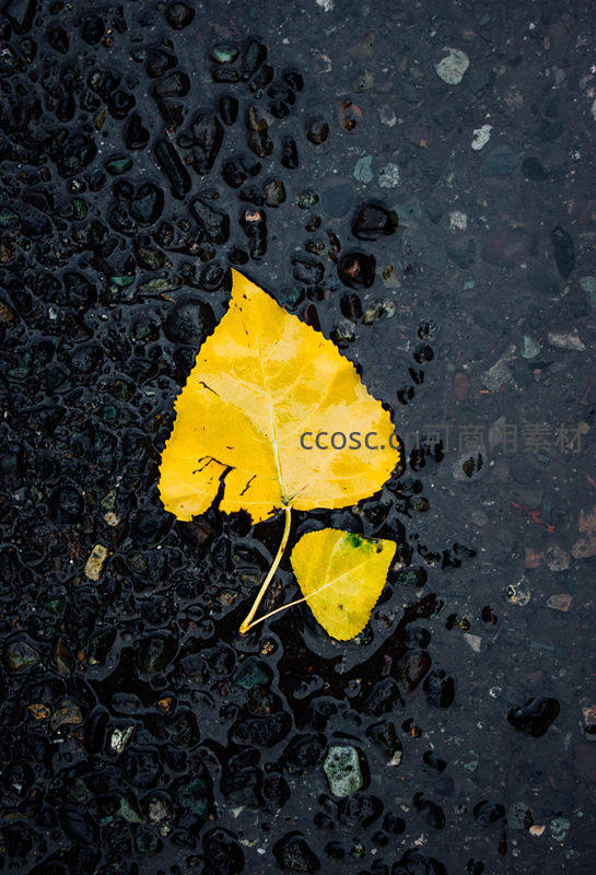 一片明黄的秋叶静静躺在布满水珠的黑色地面上,雨水浸润的纹理与落叶的脉络共同描绘出秋日的静谧诗篇。