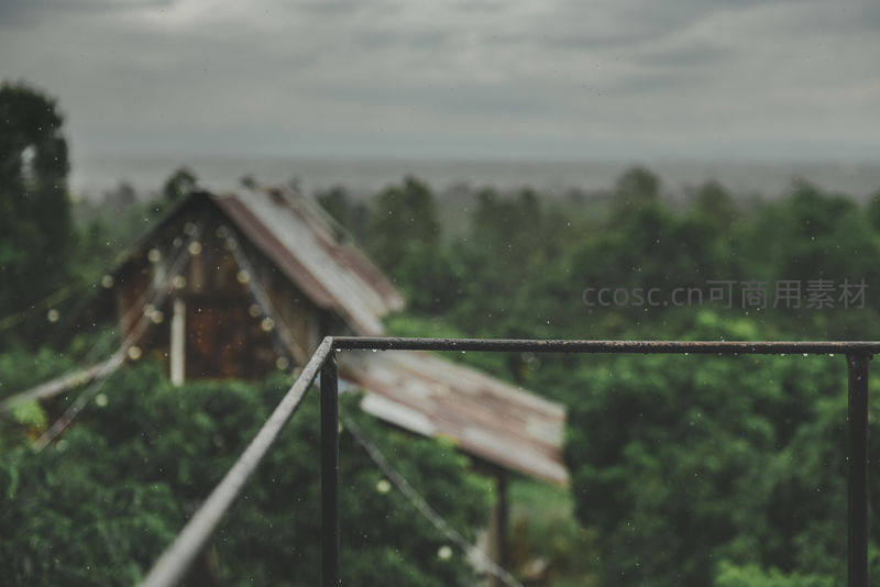 雨幕中的木屋阳台,远山绿林若隐若现