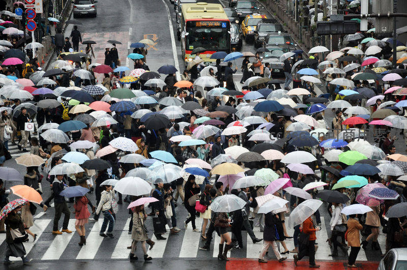 雨中繁忙十字路口,五彩伞海涌动如潮