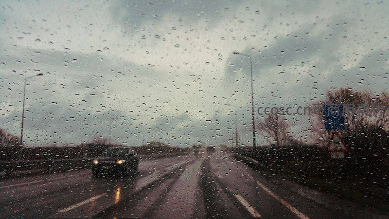 透过布满雨滴的车窗,看阴沉天空下湿滑的高速公路,车辆在雨中行驶,前方车灯在雨幕中闪烁。