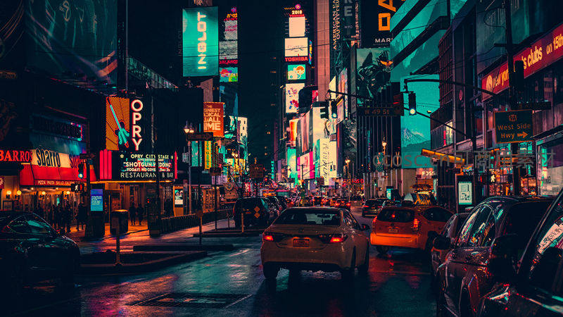 雨后的城市夜景,五彩斑斓的霓虹灯牌照亮了繁忙的街道,车辆穿梭于湿漉漉的路面,倒影交织,尽显都市的喧嚣与活力。