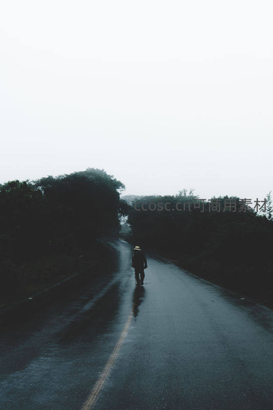 浓雾笼罩的乡间小路上,一个戴帽的身影独自前行,湿漉漉的路面反射着灰白天空,传递出宁静、孤寂与探索的意境。