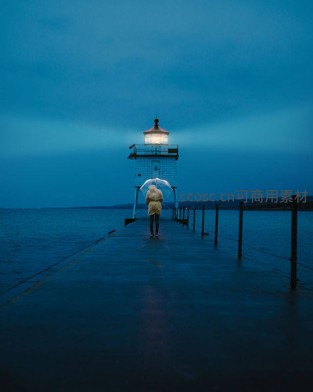 一人撑伞立于湿漉漉的码头,走向远处亮着暖光的灯塔,深蓝夜色与水面倒影营造出静谧而略带忧郁的氛围。
