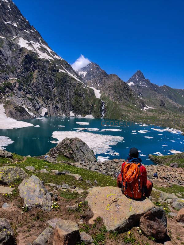 一位背着橙色背包的徒步者坐在布满碎石和野花的山坡上,背对镜头,静静凝望着前方碧蓝如玉、漂浮着冰块的高山湖泊和远处巍峨的雪山,享受着大自然的壮丽与宁静。