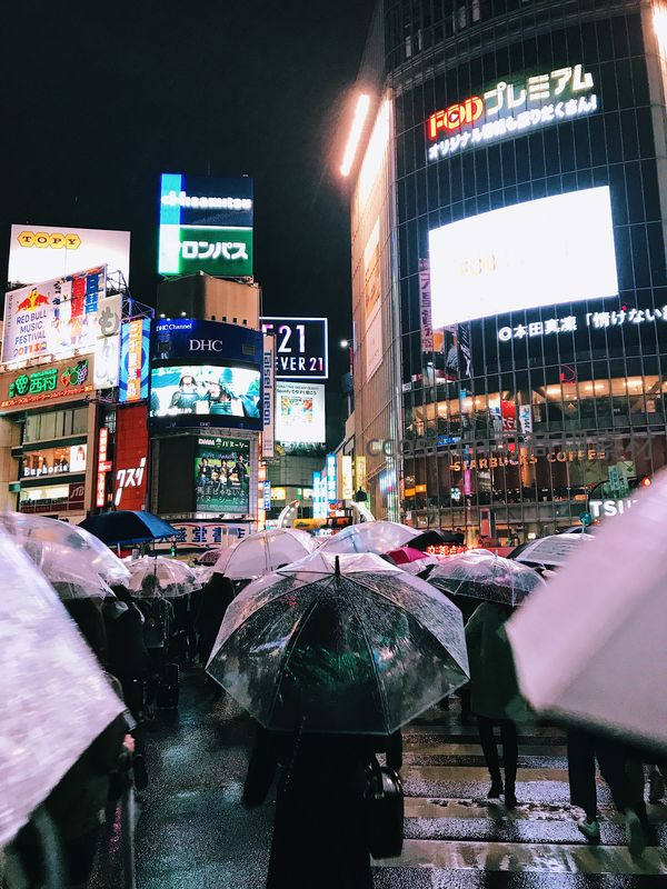 在东京涩谷的雨夜,行人们撑着透明雨伞穿梭于闪烁的巨型霓虹广告牌之间,展现了现代都市的喧嚣与活力。