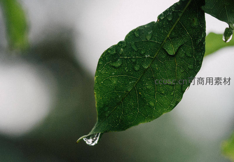 一片翠绿的叶子在微距镜头下,叶脉清晰可见,叶尖悬挂着一颗即将滴落的水珠,充满了雨后大自然的清新与宁静。