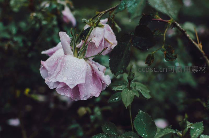 雨后的粉色玫瑰花苞上挂满了细密的水珠,在深绿色叶片的衬托下显得格外娇嫩柔美,仿佛在雨中静静低语。