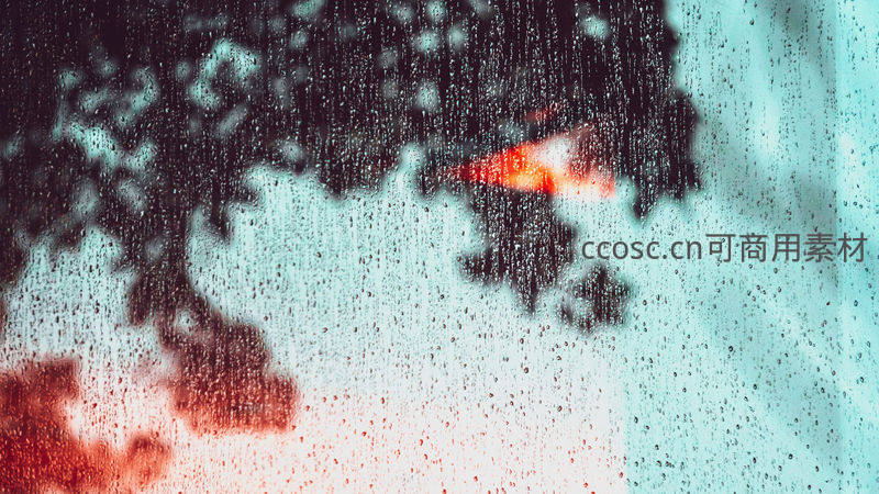透过布满雨滴的玻璃窗,外界景物被柔化成模糊的色块,红蓝光影交织,营造诗意朦胧的视觉效果。