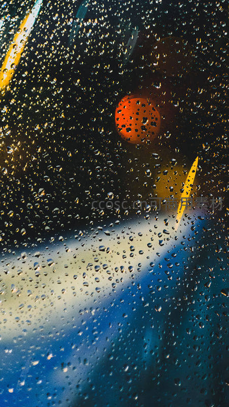 透过布满水珠的车窗,远处的霓虹灯光被晕染成梦幻的色块,呈现出迷离而富有艺术感的都市夜景。