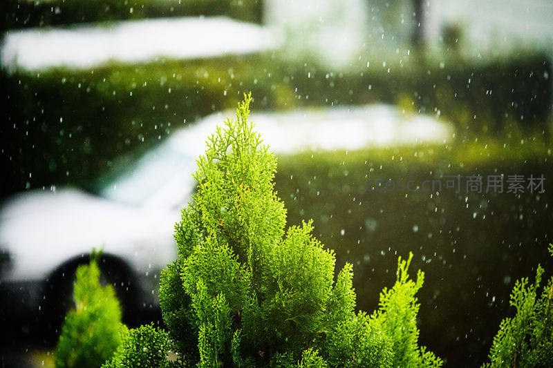 细雨纷飞中,一株翠绿的松树在风中轻柔摇曳,雨滴在空中划出优美的弧线,充满生机与活力。