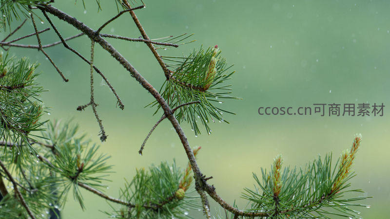 微距镜头捕捉到松树枝叶上晶莹的雨滴,嫩绿针叶在湿润中更显生机,背景虚化突出主体,呈现大自然细腻的生命力。