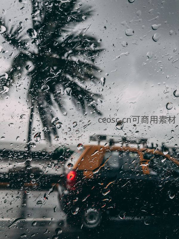 从车内透过布满雨滴的玻璃窗望出去,街上的棕榈树和一辆橙色出租车在雨幕中若隐若现,充满了都市生活的即视感。