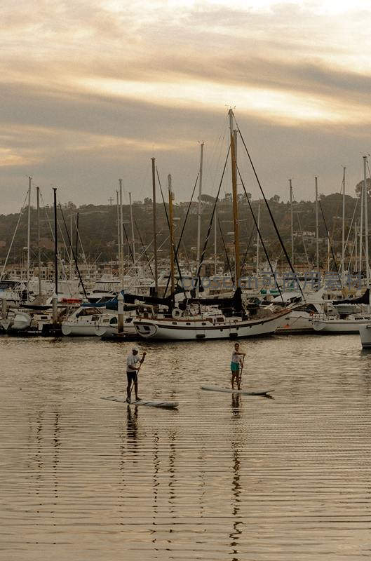 在黄昏时分的港口,两位爱好者站在桨板上划行,身后是整齐停泊的帆船群,金色阳光洒满水面,营造出宁静而富有活力的水上运动氛围。
