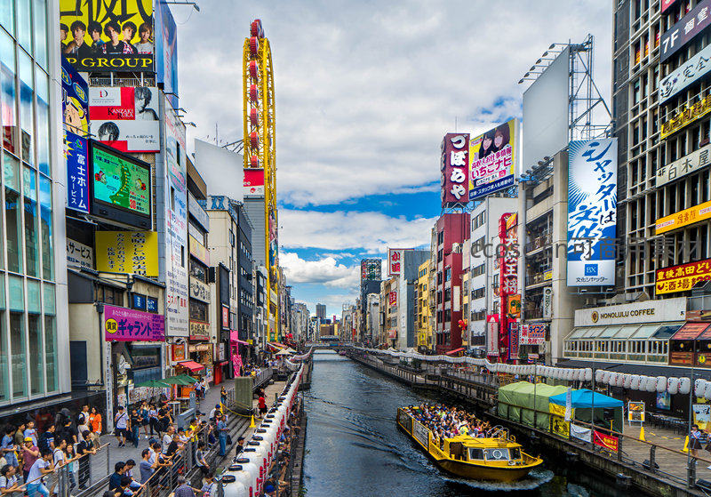 黄色观光船悠然驶过大阪运河,两岸高楼密集,巨型广告牌色彩斑斓,远处摩天轮高耸入云,构成一幅充满动感与商业气息的都市画卷。