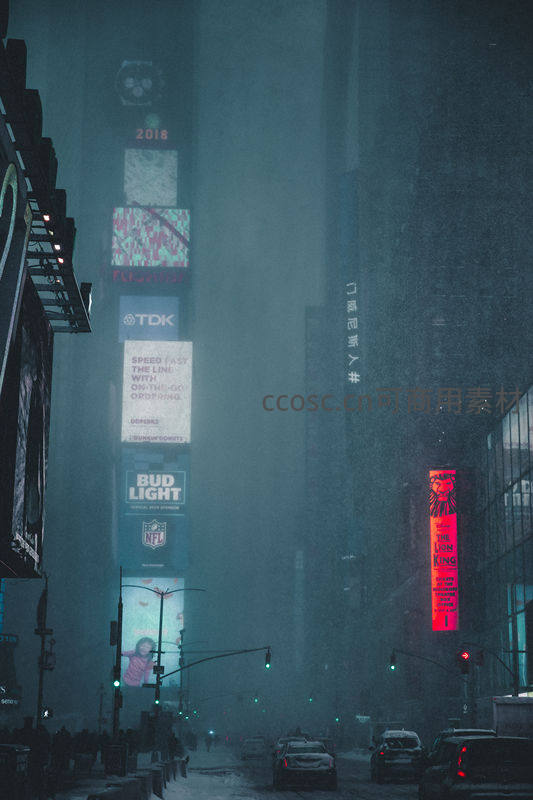 大雪纷飞的夜晚,纽约时代广场灯火辉煌,巨型广告牌在风雪中闪烁,车辆与行人穿梭其间,尽显都市的繁华与活力。