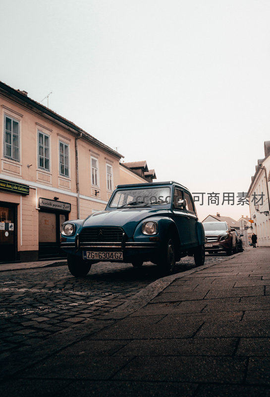 一辆经典的蓝色复古小车停在铺满石板的老城区街道上,背景是淡雅的欧式建筑,散发着浓厚的历史与怀旧气息。