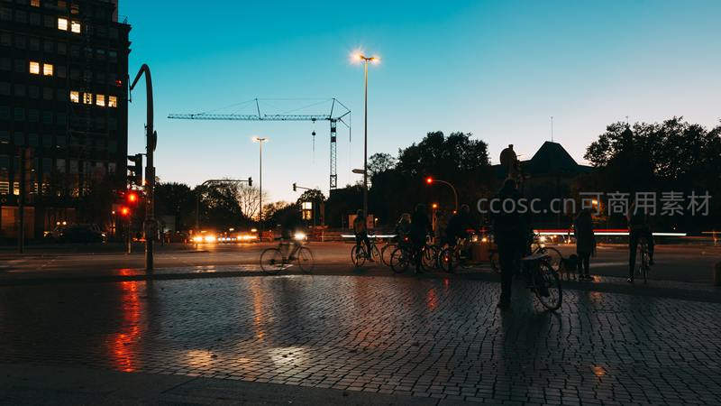 暮色广场骑行者剪影,路灯映照湿润石砖路