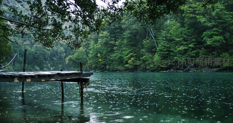 细密的雨点轻柔地落在碧绿的湖面上,激起圈圈涟漪,远处是郁郁葱葱的森林,营造出如诗如画的度假氛围。