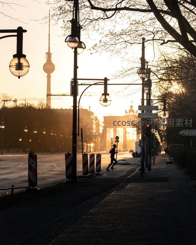 黄昏柏林街头行人剪影与电视塔