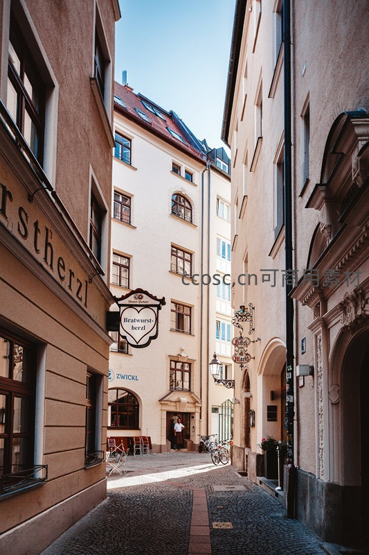 阳光洒落的欧洲窄巷,复古招牌与石板路