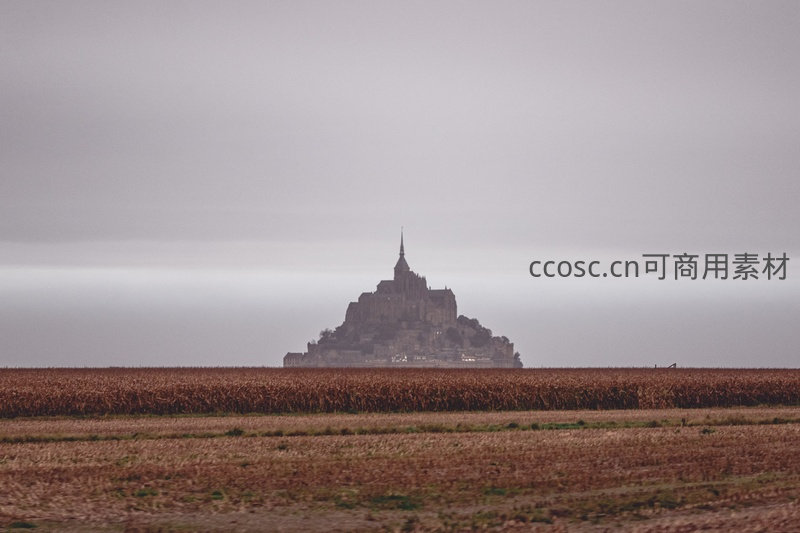 在薄雾笼罩下,法国圣米歇尔山如海市蜃楼般矗立于广袤田野尽头,古老修道院与自然融为一体,静谧而神秘。