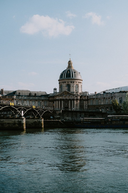 阳光洒在塞纳河上,古老的石桥横跨水面,背景是拥有巨大穹顶的宏伟建筑,展现了巴黎浪漫而庄重的城市风貌。