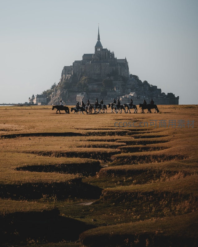 在夕阳余晖下,一队骑士骑着骏马缓缓行进在圣米歇尔山前的广阔滩涂上,背景是宏伟的修道院城堡。