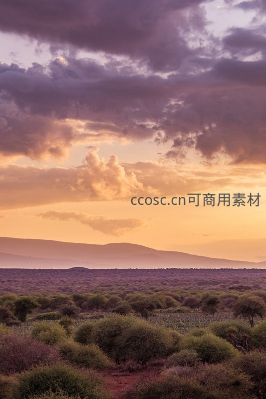 绚烂的晚霞将天空染成紫色与橙色,云层翻滚,下方是广袤无垠的灌木荒原,远方山脉轮廓朦胧,营造出一种神秘而辽阔的黄昏氛围。