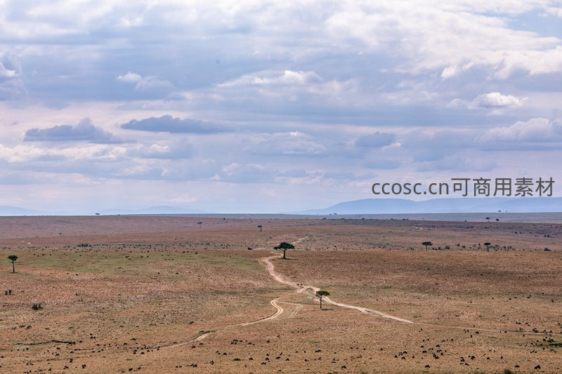 辽阔的非洲草原上,一条蜿蜒土路穿过干枯草地,点缀着孤树与成群野生动物,远处山脉与多云天空构成壮丽自然画卷。