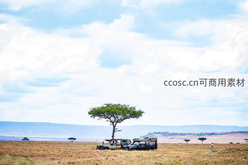稀树草原上的观光车与孤树