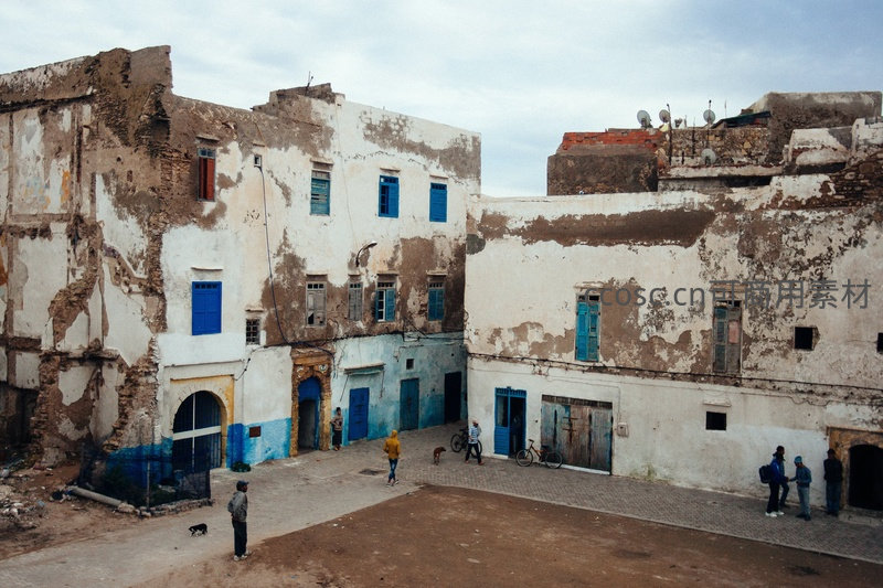 斑驳的白色泥墙与鲜明蓝色门窗构成北非古城的独特风貌,街巷中行人与犬只点缀其间,诉说着时光沉淀下的生活气息与历史痕迹。