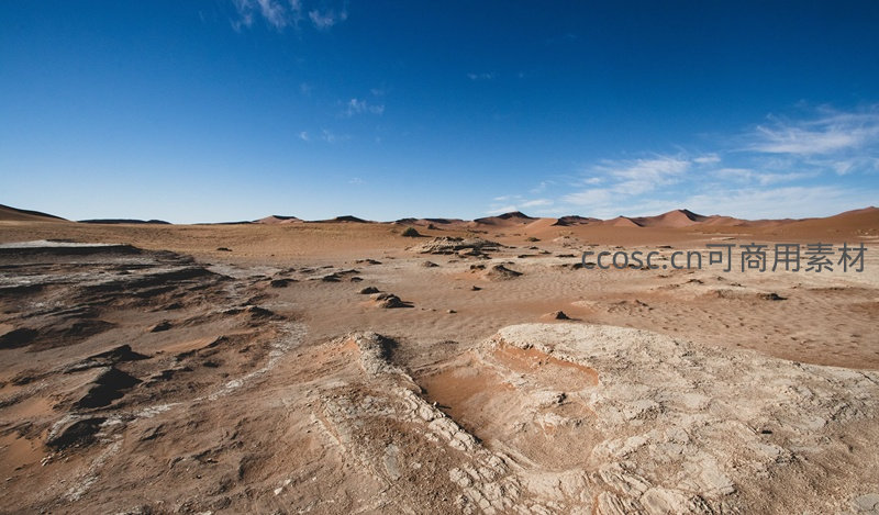 辽阔的干旱荒原上,红褐色的土壤与岩石裸露,远处连绵的沙丘在清澈蓝天的映衬下延伸至地平线,构成一幅原始而宁静的大地风景画。