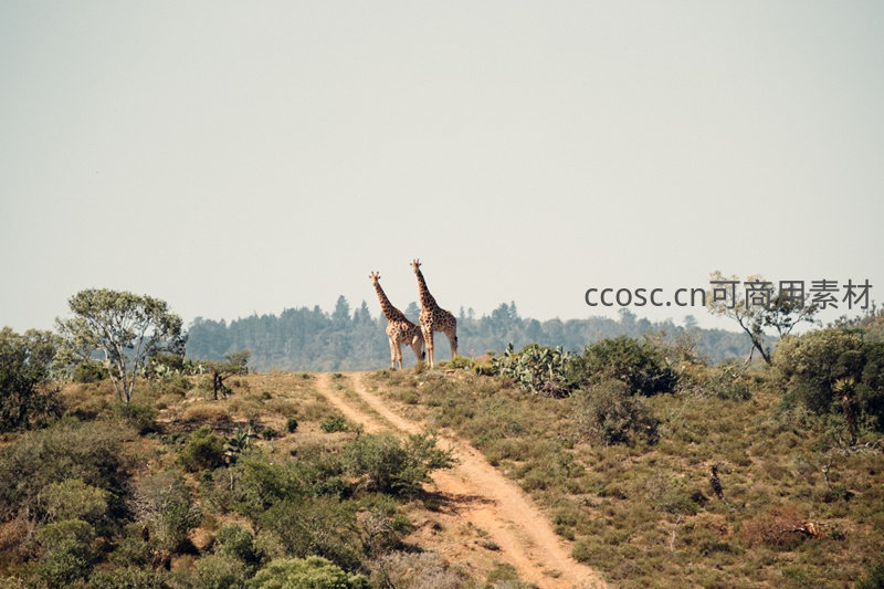 两只长颈鹿并肩伫立在非洲草原的小径尽头,周围灌木丛生,远处林线隐约可见,它们悠然眺望远方,成为这片宁静天地中最优雅的风景。