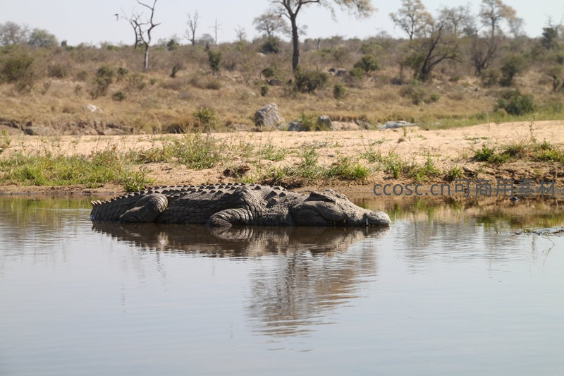 一只巨大的鳄鱼半潜于清澈的水中,仅露出背部和头部,其粗糙的皮肤在阳光下清晰可见。背景是干燥的非洲草原,稀疏的树木和灌木丛延伸至远方,水面倒映着它的身影,营造出一种原始而宁静的氛围。