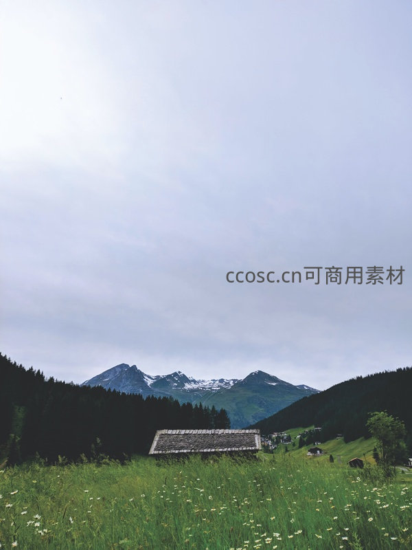 一片开满白色野花的绿色草甸延伸至远方,一座质朴的木屋静静伫立其中,背景是连绵起伏的雪山和茂密森林,散发出远离尘嚣的宁静气息。