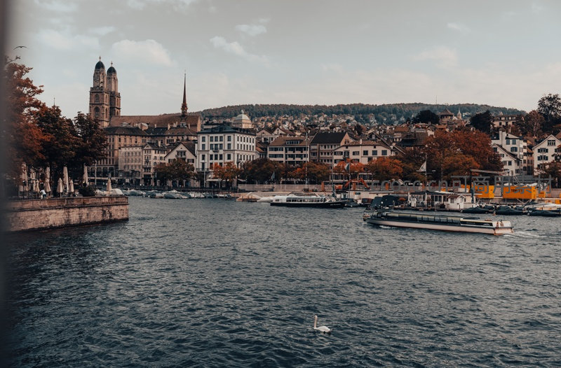 苏黎世湖面波光粼粼,一只优雅的白天鹅悠然游弋,对岸是历史悠久的欧式建筑群和高耸的教堂尖塔,展现出古典与现代交融的城市魅力。