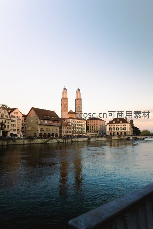 夕阳西下,金色的光辉洒在古老的双塔教堂上,其倒影清晰地映在平静的河面,两岸的欧式建筑静谧而优雅,充满历史韵味。