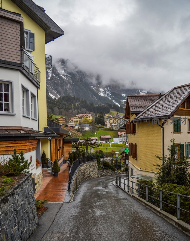 云雾锁峰小镇静,彩色屋舍沿坡建