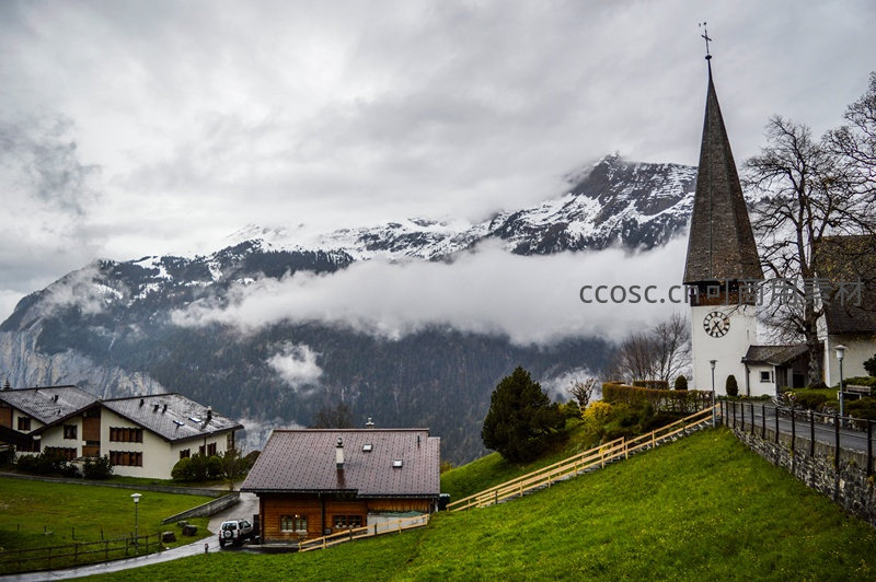 在连绵的雪山与飘渺云雾之间,一座尖顶教堂静静矗立于绿意盎然的山坡之上,周围散布着传统木屋,构成一幅宁静祥和的阿尔卑斯山间画卷。