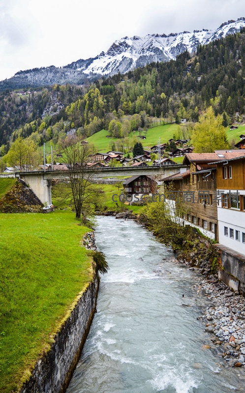 一条湍急的河流奔腾于村庄边缘,两岸是错落有致的传统木屋和郁郁葱葱的草坡,远处白雪皑皑的山峰为背景,营造出宁静又充满活力的瑞士乡野风情。