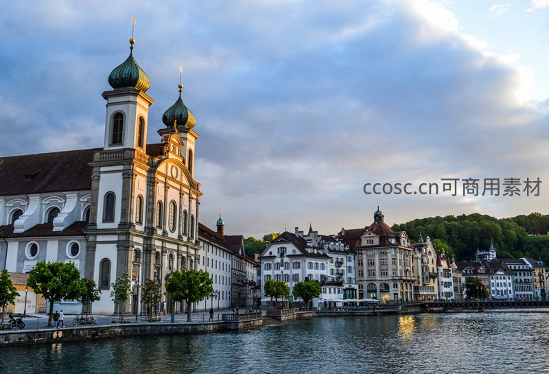 夕阳西下,卢塞恩耶稣会教堂绿色洋葱顶在暖光中熠熠生辉,沿河古典建筑立面倒映于罗伊斯河面,波光粼粼,行人漫步河畔,呈现宁静而庄严的中欧古城黄昏画卷。